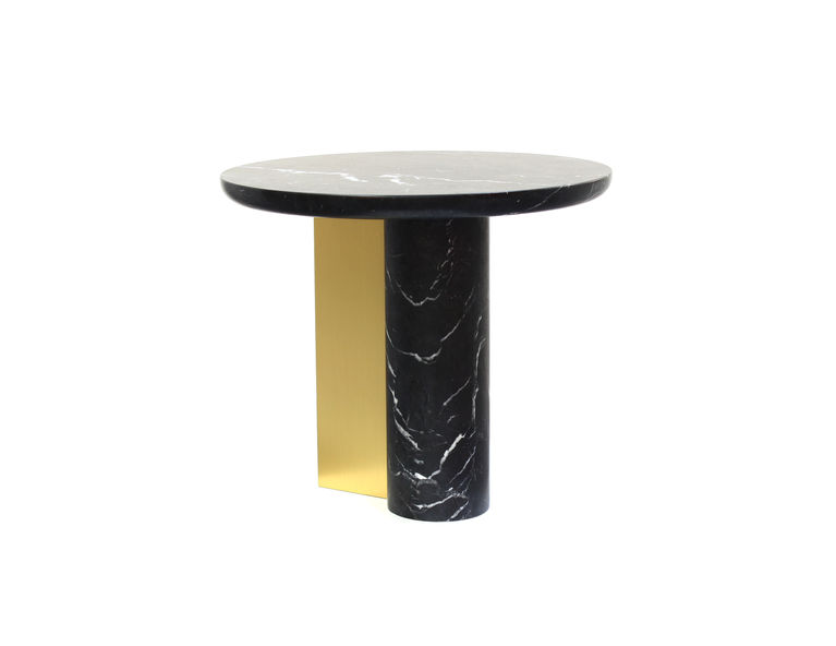 This monolithic side table has an elegant and refined silhouette. An off-balanced cylindrical solid base attached to a circular top is supported by a folded brass plate enlightening and balancing the piece.
